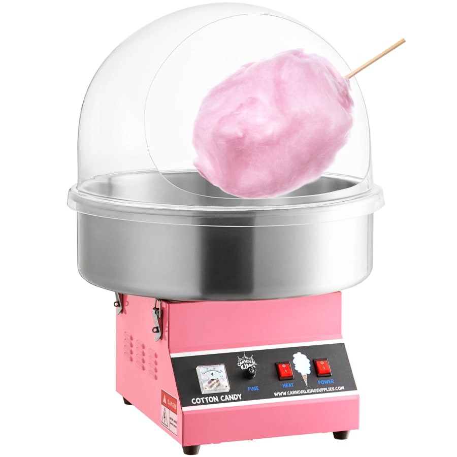 Serve fresh, fluffy cotton candy at every party or event with this commercial-grade cotton candy machine. Featuring a large 21" stainless steel bowl and a clear protective floss bubble, it produces up to 80 cones per hour with quiet, low-vibration operation — perfect for indoor or outdoor use.