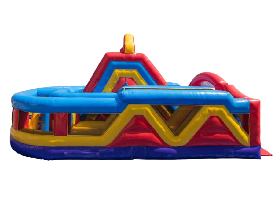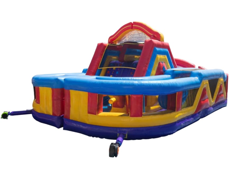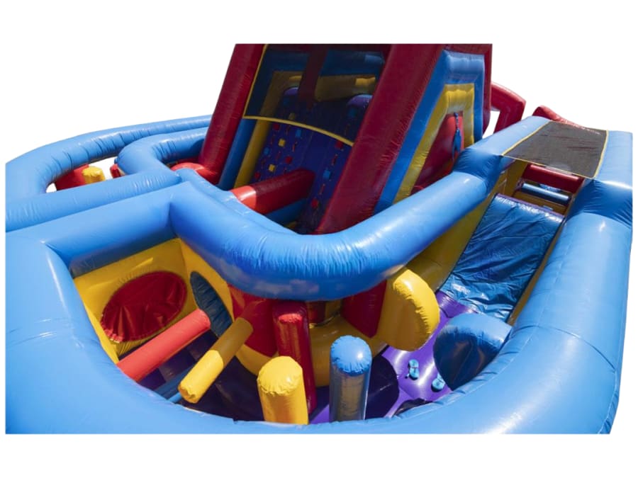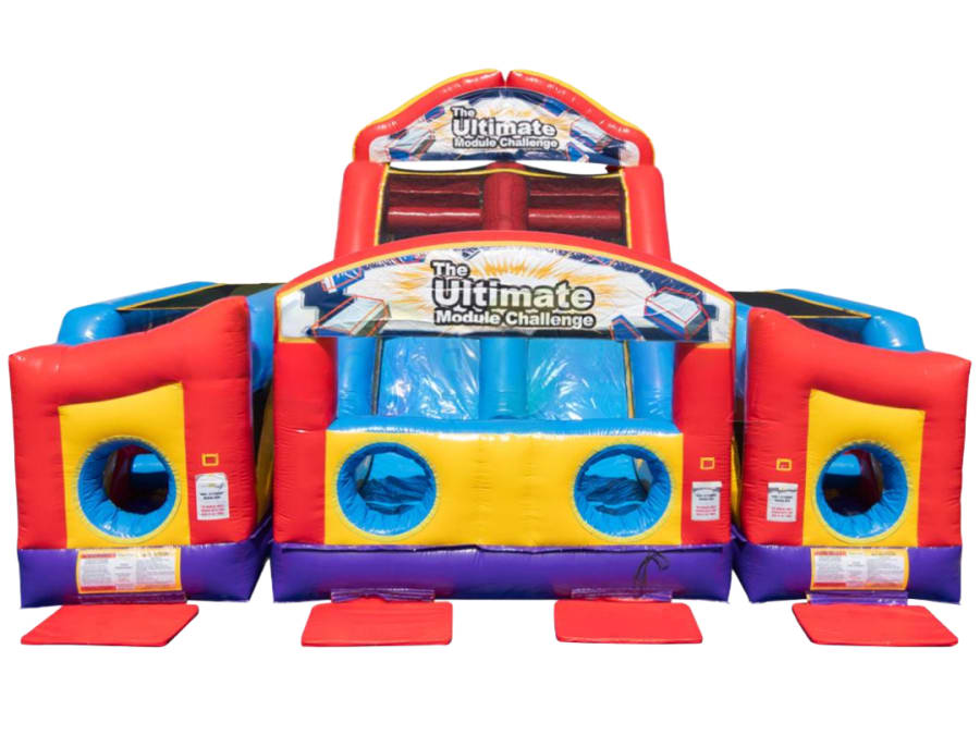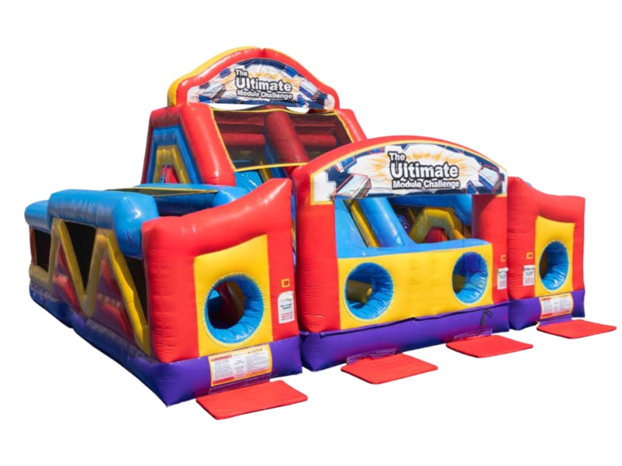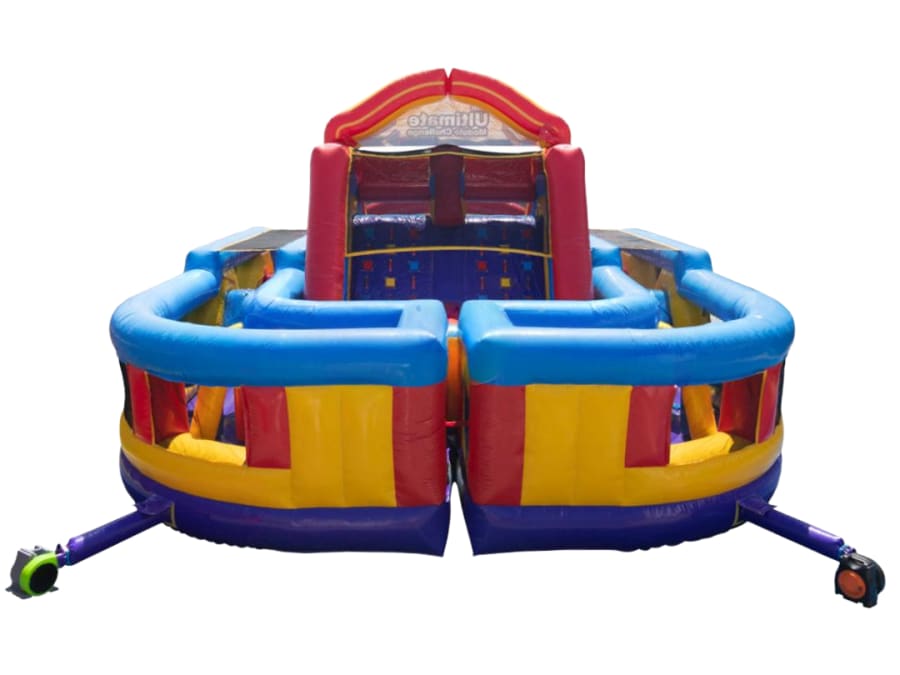 Bring high-energy action to your event with this giant modular inflatable obstacle course from Frankie's Carnival Time. Featuring dual racing lanes, slides, climbing walls, tunnels, and pop-up challenges, it delivers fast-paced fun and friendly competition for kids and adults alike.